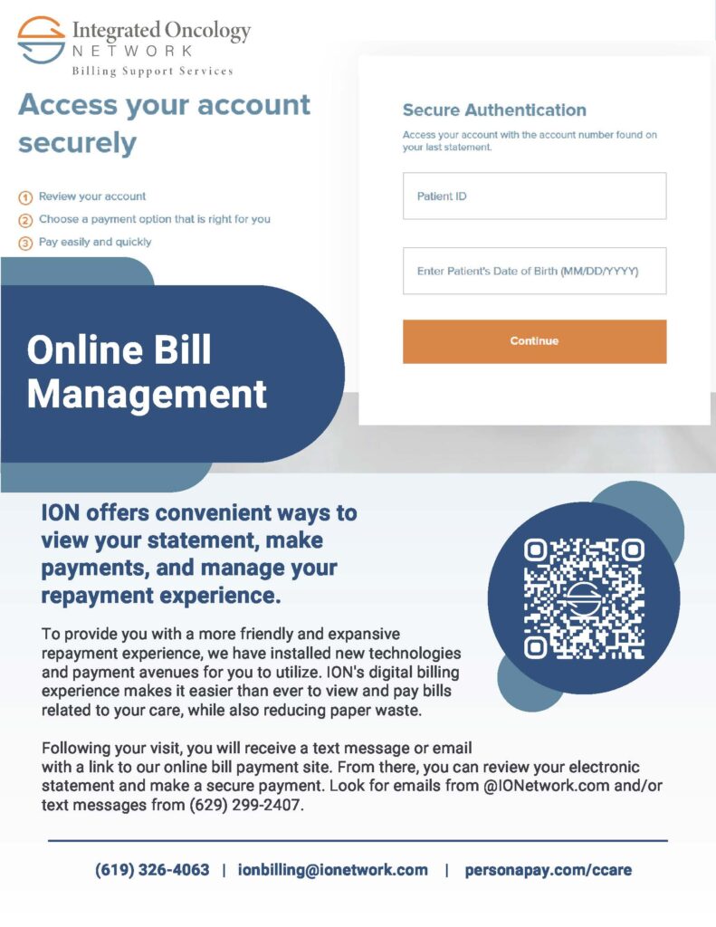 To provide you with a more friendly and expansive repayment experience, we have installed new technologies and payment avenues for you to utilize. ION’s digital billing experience makes it easier than ever to view and pay bills related to your care, while also reducing paper waste. Following your visit, you will receive a text message or email with a link to our online bill payment site. From there, you can review your electronic statement and make a secure payment. Look for emails from @ionetwork.com and texts from 629-299-2407.